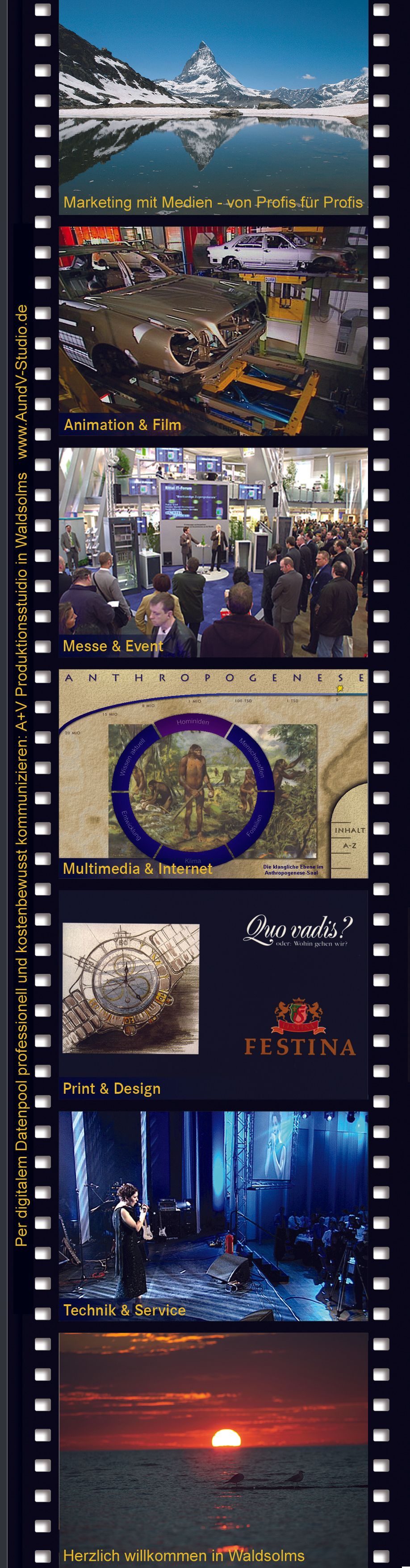 Die Entscheidung für A+V Produktionsstudio ist in der Regel der Beginn einer längeren Partnerschaft. Die geprägt ist von beiderseitigem Vertrauen, persönlichem Engagement auch in "kleinen" Dingen, Zuverlässigkeit in der Terminabwicklung, Qualität der Produktionen und Funktionssicherheit der Installationen.